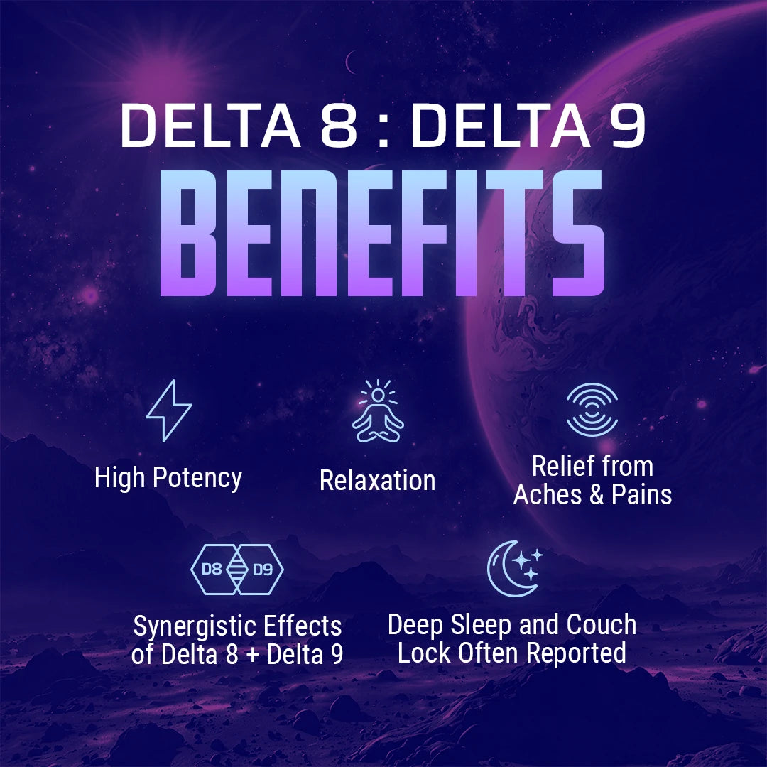 If you’re looking for a way to calm your mind and body after a long day, drift off to dreamland, or help with pain management, Delta 8:Delta 9 is the perfect combination to harness some of the greatest benefits of each cannabinoid, such as improved sleep, relaxation, and pain and anxiety relief.