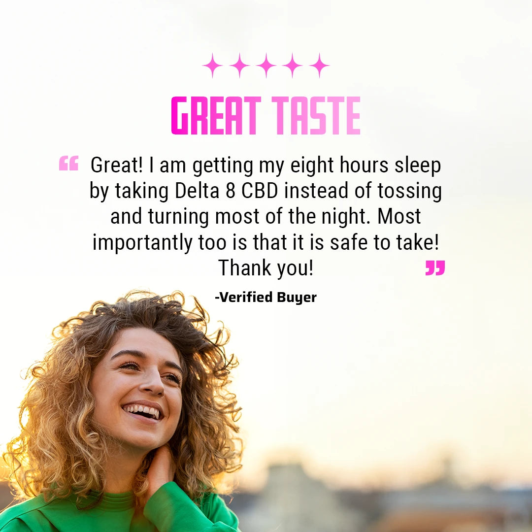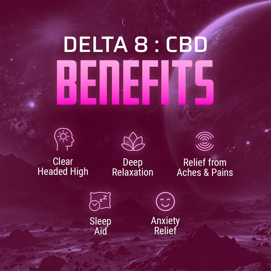 CBD and Delta 8 work in combination to provde maximum relaxation, pain relief, and euphoria. Delta 8 offers a gradual onset of effects which allows you to ease into the experience, relax, and enjoy the ride!